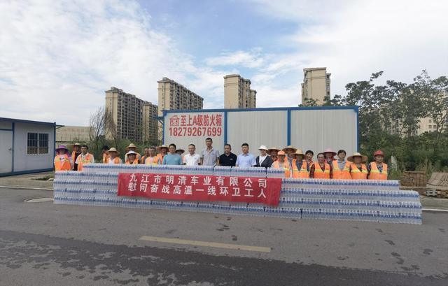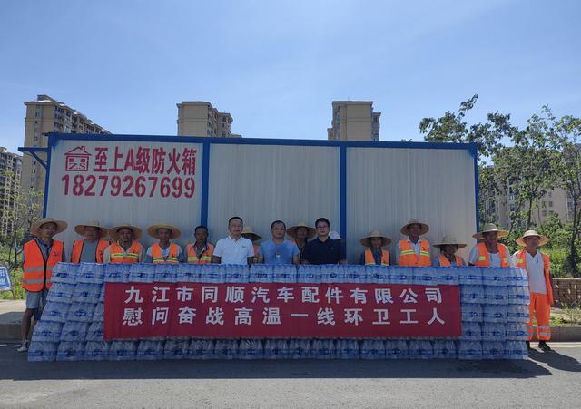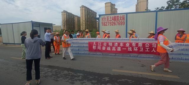 7月22日,时值三伏天,酷暑高温时刻“烤”验着奋战在一线的“城市美容师”们,九江市明清车业有限公司总经理何营、副总经理陈世军与九江市同顺汽车配件有限公司总经理张冰一行来到九江经开区玉禾田环境发展有限公司奉献自己的拳拳爱心,各自送来100件矿泉水,向奋战在高温一线岗位的保洁员们送去关怀。